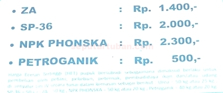 Disebutkan, sesuai Peraturan Menteri Pertanian bernomor 112/Permentan/SR.130/11/2013 tertanggal 26 Nopember 2013 tentang kebutuhan dan HET pupuk bersubsidi Untuk sektor pertanian tahun 2014, disebutkan pupuk urea Rp 1.800 per kilogram, pupuk SP36 Rp 2.000 per kilogram, pupuk ZA Rp 1.400 per kilogram, pupuk NPK Rp 2.300 per kilogram dan pupuk organik Rp 500 perkilonya. MUHLISHIN, MUHAIMIN