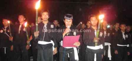 Sebelumnya, ikrar bersama dipimpin oleh Ketua PSHT Ranting Rengel, Lukman, didampingi dua pendekar di bawah cahaya obor. Dengan bersemangat dia membacakan empat butir ikrar yang diikuti seluruh pendekar.