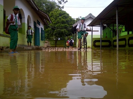 seputartuban.com – Banjir yang melanda Desa Mandirejo, Kecamatan Merakurak, Senin (14/12/2015) menyebabkan aktifitas sekolah terganggu. Saat Ujian Akhir Semester (UAS), Selasa (15/12/2015) pagi kondisi sekolah masih tergenang lumpur.