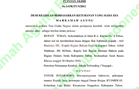 Upaya peninjauan kembali Pemkab Tuban sebagai tergugat yang diajukan ke Mahkamah Agung pada 4 Oktober 2011, hasilnya tetap memenangkan Yoyok dengan nomor putusan No.14 PK/TUN/2012. Yang intinya menguatkan putusan PT TUN diantaranya membatalkan SK pemberhentian Bupati dan memerintahkan mengembalikan jabatan.