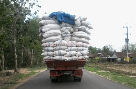 Kendaraan truk, truk engkel hingga mobil pik up mengangkut sekam padi berlebihan. Beberapa diantaranya melintas secara beriringan dengan mengangkut sekam padi menggunung.