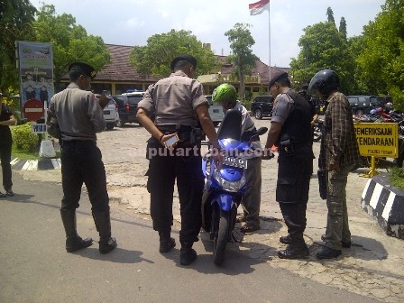 TELITI : Salah satu pengunjung yang menggunaka sepeda motor diperiksa dengan detail oleh anggota Polres Tuban