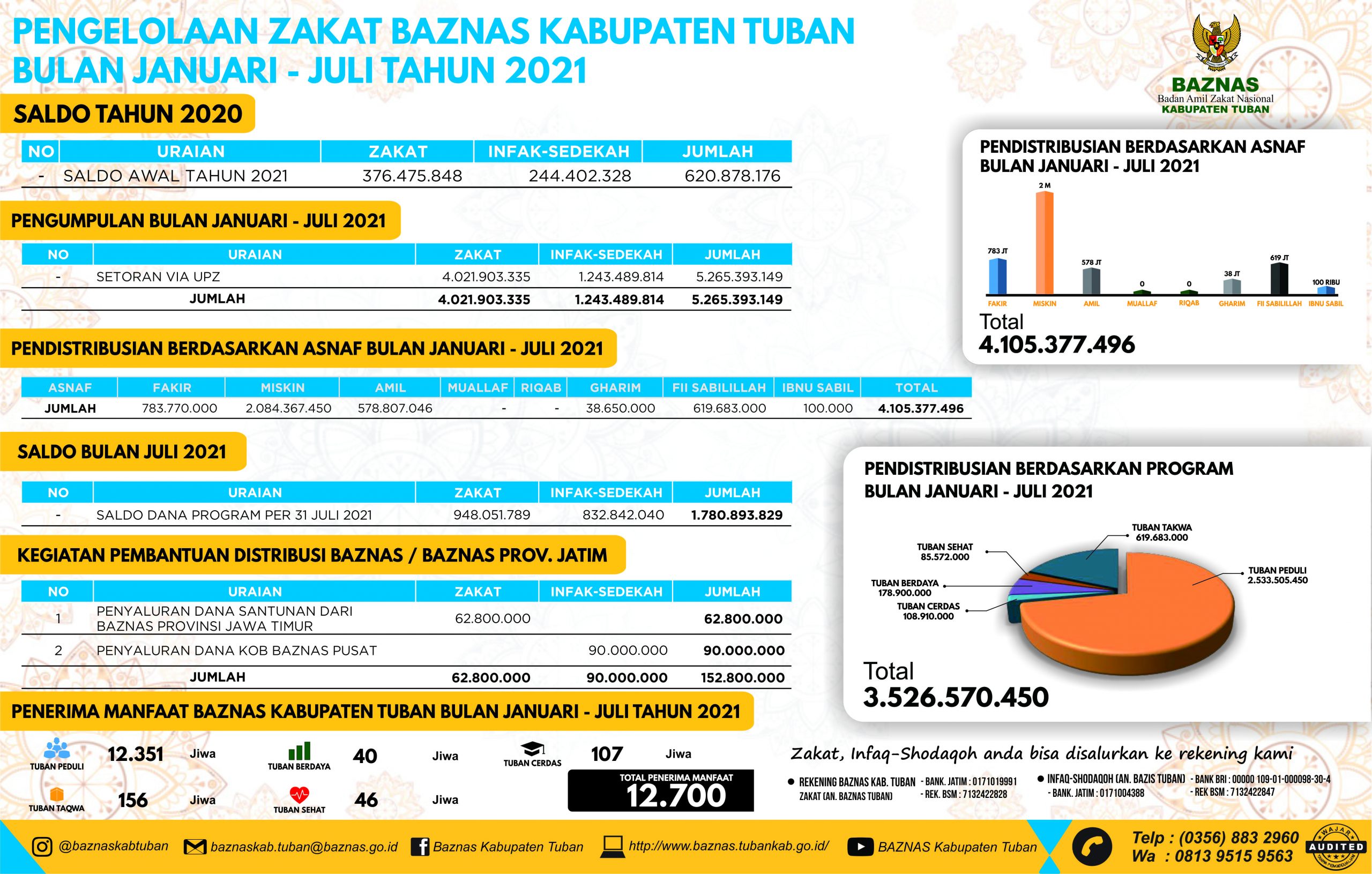 Sektor lain dalam pengelolaan ZIS adalah pendistribusian dan pendayagunaan. Selama kurun waktu Januari-Juli 2021, dana ZIS yang tersalurkan sejumlah Rp. 3.526.570.450,-. Dana tersebut tersalurkan melalui 5 program pendistribusian dan pendayagunaan BAZNAS Kabupaten Tuban, meliputi: Tuban Peduli, Tuban Sehat, Tuban Takwa, Tuban Berdaya dan Tuban Cerdas; serta untuk operasional sejumlah Rp. 578. 807.046.