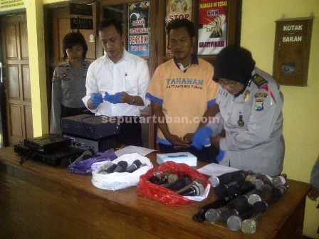 seputartuban.com – Abdullah Falah (43), kini meringkuk di tahanan Mapolres Tuban. Karena aksi pencurian mikropon masjid yang diduga dilakukanya dibongkar Polisi. Dia ditangkap dirumahnya, Desa Tegalagung, Kecamatan Semanding, Kabupaten Tuban, Senin (14/12/2015).