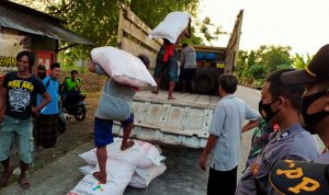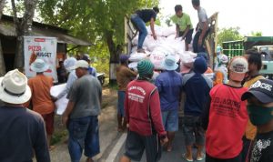 SANGAT LANGKA : Warga usai menurunkan pupuk subsidi dari truk distribusi mendapat arahan dari aparat kepolisian setempat