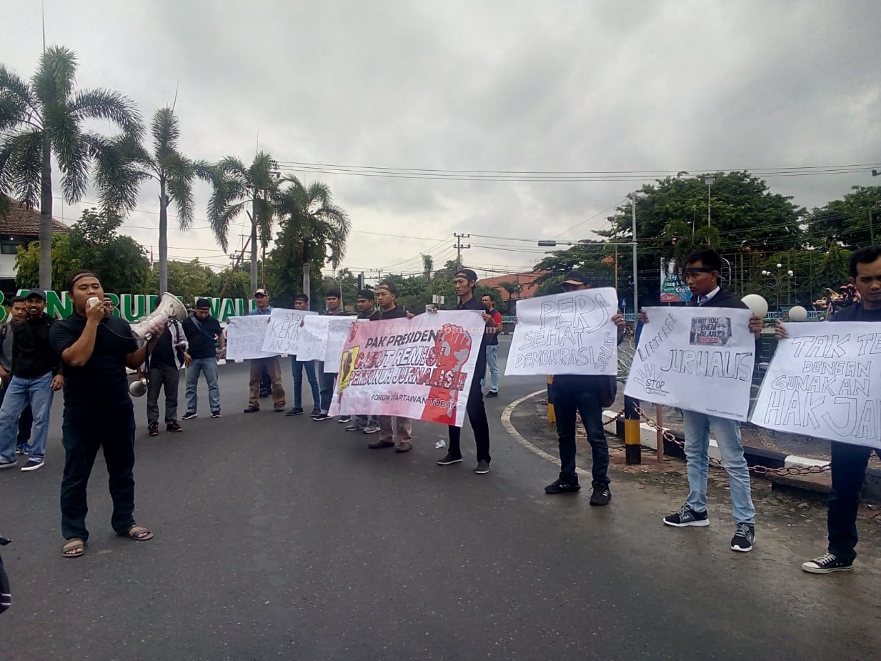 seputartuban.com, TUBAN – Forum Wartawan Tuban, Senin (28/1/2019) turun jalan untuk menuntut Presiden Joko Widodo mencabut remisi yang telah diberikan kepada pembunuh wartawan. Aksi tersebut dilakukan di kawasan Bundaran Patung Letda Sucipto Tuban.